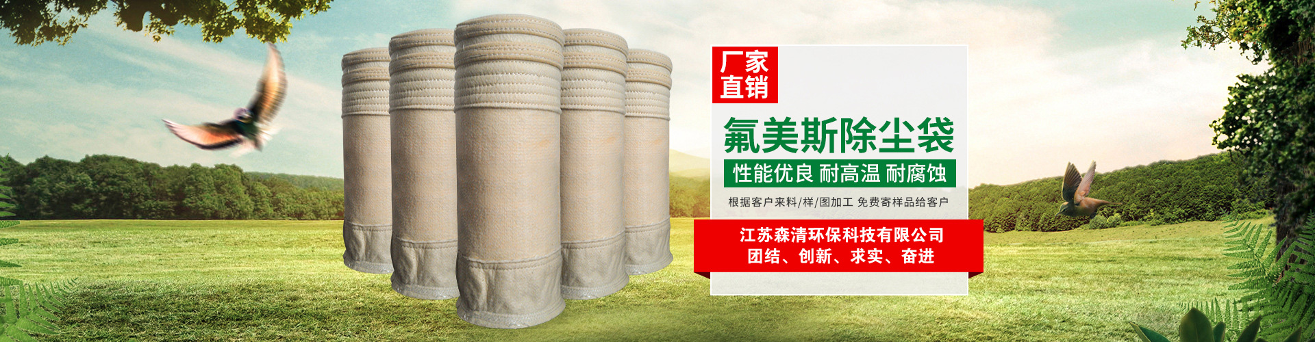 公司主營無堿、中堿玻纖濾袋,PTFE浸漬膨體覆膜(水泥廠窯頭,窯尾專用),無紡高溫、